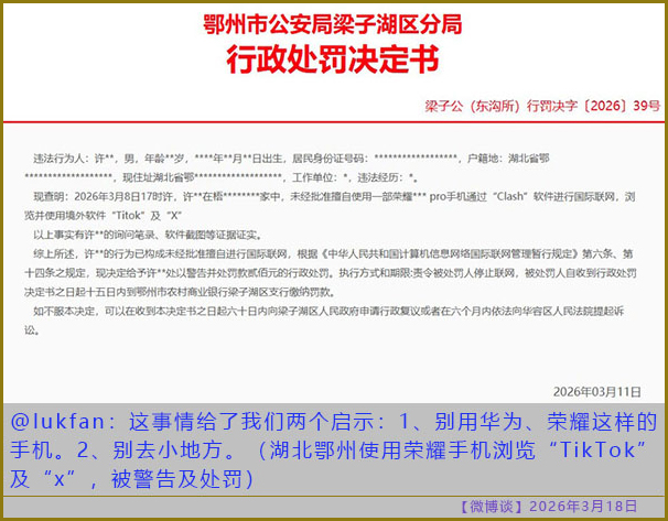 男子“擅自浏览并使用境外软件”Tiktok及X被处罚